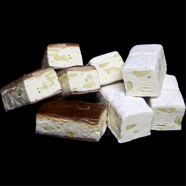 Creamy nougat packed with crunchy roasted cashews. A rich, nutty delight handcrafted for indulgent snacking or elegant gifting.
