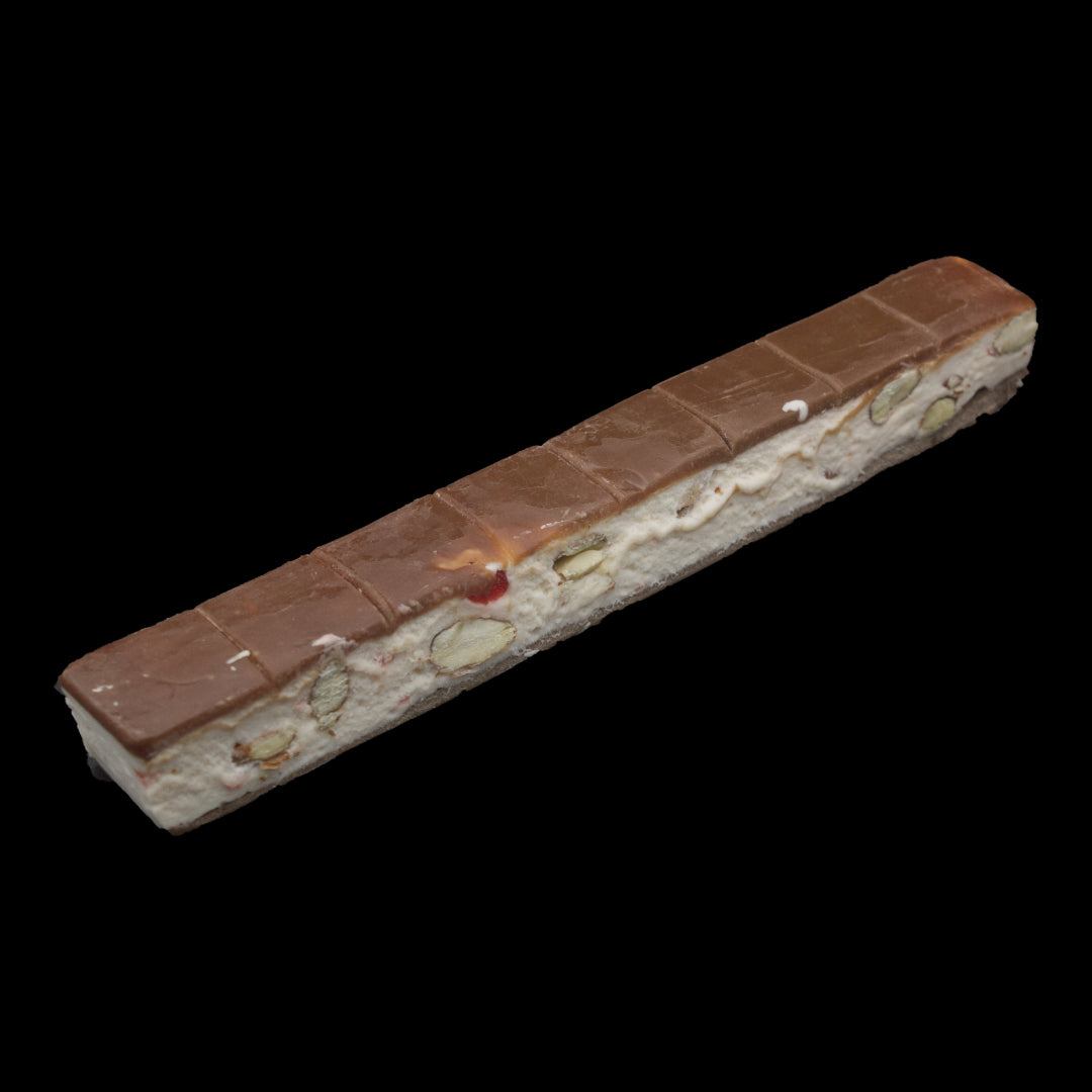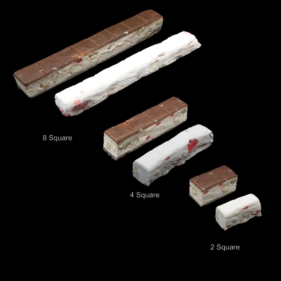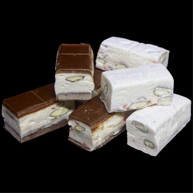 Soft nougat infused with tangy cherries and roasted almonds. A fruity, nutty delight handcrafted for indulgent snacking or thoughtful gifting.