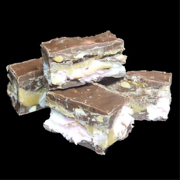A rich mix of chocolate fudge, crunchy nuts, and fluffy marshmallows. Handmade Rocky Road candy that’s perfect for snacking or sweet gifting.